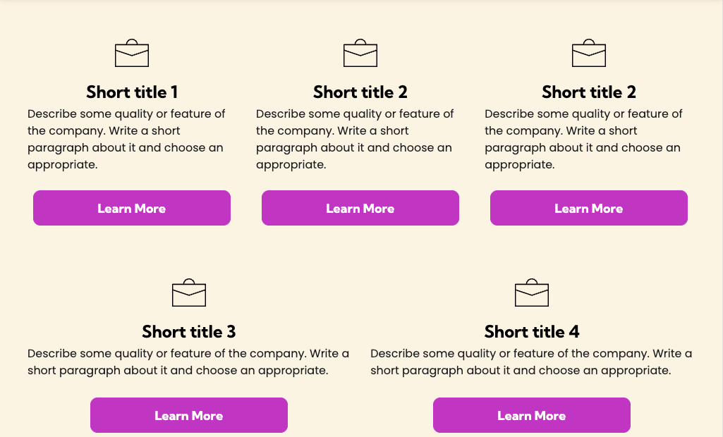 Copy blocks with icons are small content features that pair an icon with a short piece of text — usually a title, a brief description, and sometimes a “Learn More” button.